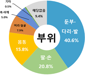 사고 사례를 분석해 보면, ‘둔부·다리·발’ 등 하체 부상이 전체의 40.6%로 가장 많았고, ‘팔·손’ 부위 부상이 뒤를 이었습니다. 이는 착지 과정에서 발목이 꺾이거나, 반사적으로 손을 짚으며 손목, 팔꿈치 등을 다치는 경우가 많기 때문입니다.