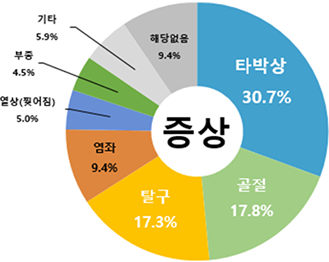 증상별로는 ‘타박상’이 30.7%(62건)로 가장 많았지만, 골절이나 탈구 등 중상을 입은 경우도 적지 않았습니다. 특히 10세 미만 어린이의 경우 추락 시 머리나 얼굴 쪽을 다치는 경우가 많아 보호자분들의 각별한 주의가 필요합니다.
