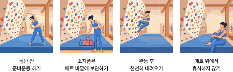 실내 인공 암벽 등반 시 초보자는 반드시 전문 강사의 지도를 받은 후 이용하고, 부상 방지를 위해 등반 전 충분히 준비운동을 하시기 바랍니다. 완등 후에는 홀드(손잡이)를 잡고 천천히 내려오고, 착지할 때는 양발로 충격을 분산시킨 뒤, 무릎을 굽혀 착지해 안전사고를 예방하시길 당부드립니다.