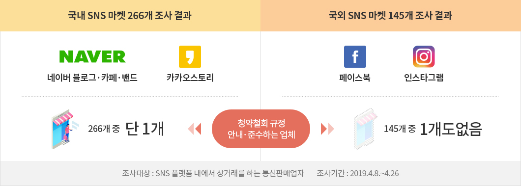 블로그 같은 국내 SNS 마켓의 경우 조사 대상 266개 업체 중 1개를 제외한 모든 업체가 환불 거부, 청약철회 기간 축소 등으로 소비자의 청약철회를 방해하고 있었습니다. 특히 1:1 주문제작, 공동구매 등의 사유로 청약철회가 불가하다고 고지하거나, 법정 청약철회 기간인 7일을 1~3일로 축소하는 사례가 많았습니다. 더욱이 인스타그램 같은 국외 SNS 마켓 중 청약철회 규정을 제대로 안내하거나 지키는 곳은 단 한 곳도 없었습니다.