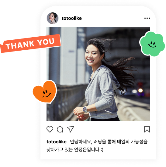 저는 두 개의 러닝 크루를 운영하고 있는데요. 스포츠 브라탑을 입고 달리는 ‘탑걸즈 크루’와 아이와 함께 달리는 ‘캥거루 크루’예요. 겉모습은 다르지만 공통점이 있습니다. 혼자서 쉽지 않은 도전을, 함께하면 끝까지 완주할 수 있다는 점. 서로의 호흡에 힘이 실리고, 서로의 발걸음에 자신감을 갖게 되는 것 같아요. “빨리 가려면 혼자 가고, 멀리 가려면 함께 가라.”라는 속담처럼요. 오래 그리고 더 멀리 달리고 싶다면 함께 달려보세요.