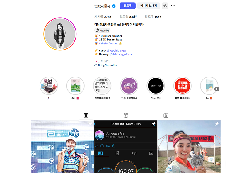 풀코스 마라톤 13번, 250km 몽골 고비 사막 마라톤, 100miles(160km) 논스톱 트레일 러닝, 2번의 철인 3종 경기까지! 10km 최고 기록은 43분, 풀코스 최고 기록은 3시간 48분이에요. 400개가 넘는 마라톤 완주 메달이 있지만, 그래도 가장 소중한 메달은 대한민국 최연소로 세계 6대 마라톤을 완주한 6성 메달이랍니다.