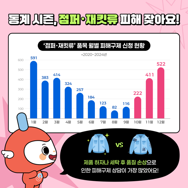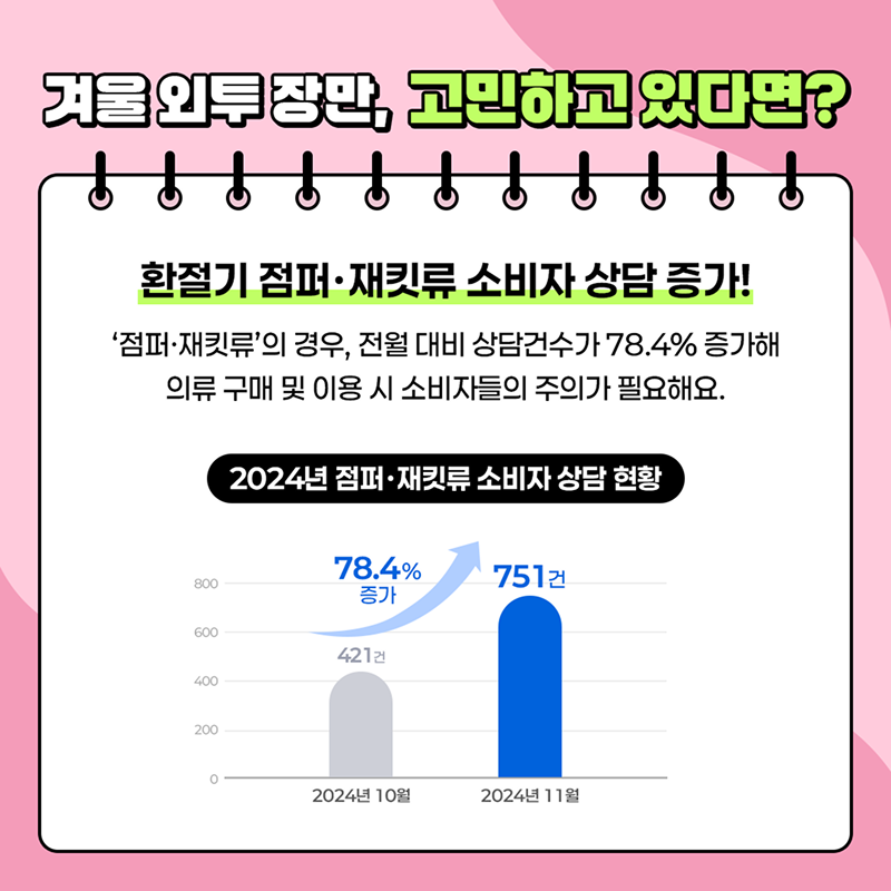 - 2024년 11월 기준, 점퍼·재킷류 관련 소비자 상담건수가 전월 대비 78.4% 증가했어요.