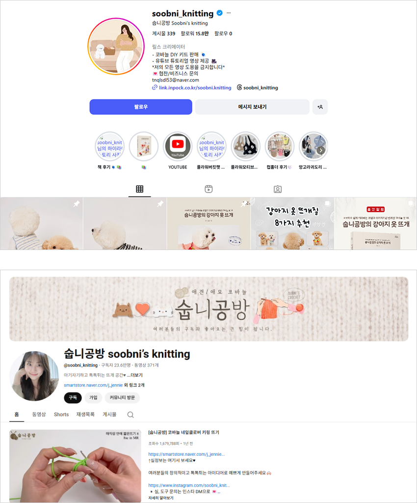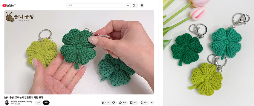 네잎클로버 키링 도안 영상이 가장 반응이 좋았어요. 짧은 시간 안에 만들 수 있는 실용적인 소품이라서 처음 뜨개를 접한 분들도 부담 없이 도전하셨던 것 같아요. 덕분에 숩니공방을 많은 분께 알릴 수 있는 계기가 된 고마운 콘텐츠입니다. 그간 강아지 옷 위주로 작업하던 제게 사람들이 어떤 소품에 관심을 가지는지를 알게 해줬고, 이후 작업 범위를 확장하는 데에도 좋은 영향을 받았어요.