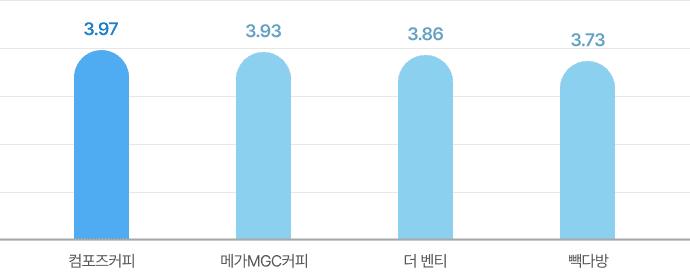 조사 결과, 종합만족도는 컴포즈커피가 3.97점(5점 만점)으로 가장 높게 나타났는데요. 매장 이용 과정에서는 고객 응대와 고객 공감, 매장 운영 전문성에서 높은 점수를, 상품의 경우 메뉴의 품질, 주문·결제·이용의 편의성, 취소·변경·환불이 원만하다는 평가를 받았습니다.
