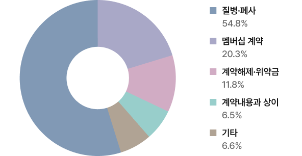 2022년부터 2025년 6월까지, 최근 3년 6개월간 한국소비자원에 접수된 반려동물 관련 소비자 피해사례는 총 743건. 접수된 사례 중 ‘반려동물의 질병·폐사’가 54.8%(407건)로 가장 많았고, 뒤를 이어 멤버십 계약 관련이 20.3%(151건)로, 두 가지 유형이 전체 피해의 75.1%를 차지했습니다.