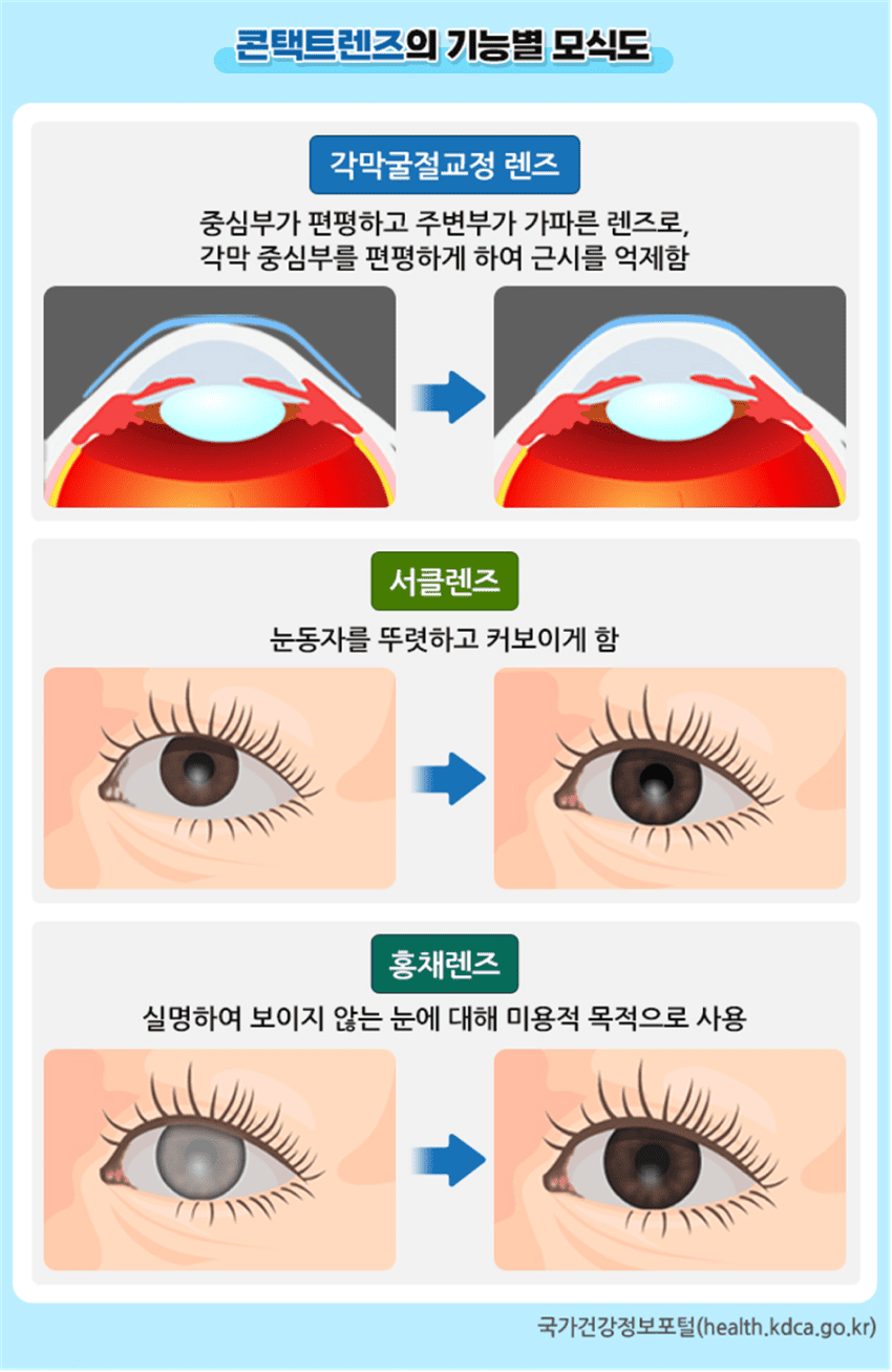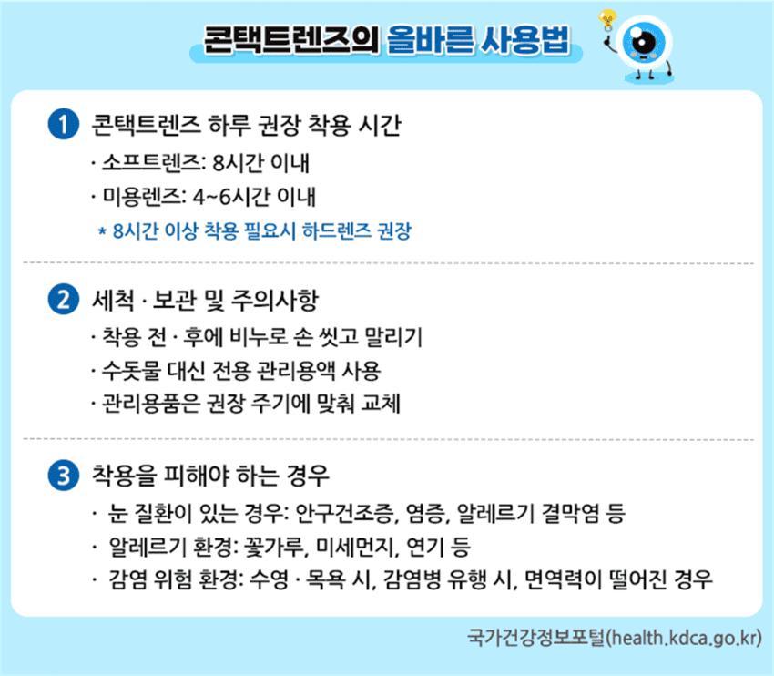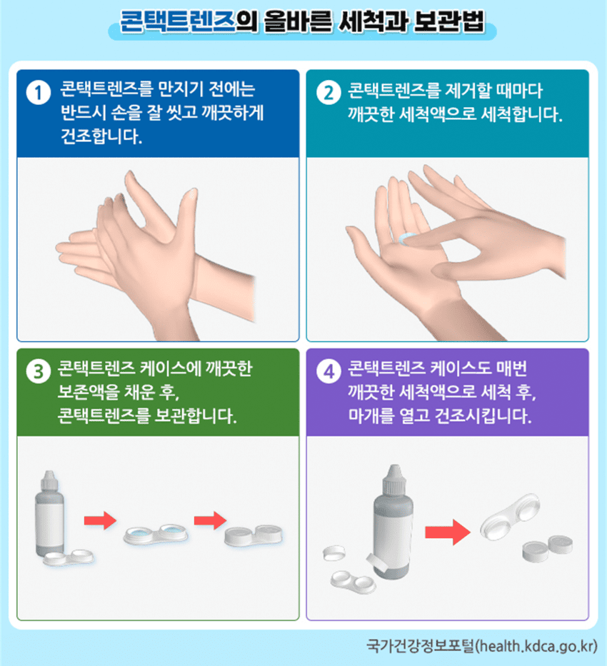 본 저작물은 ‘질병관리청’에서 공공누리 제4유형으로 개방한 ‘콘택트렌즈, 올바른 사용이 눈 건강을 지킵니다’를 이용하였으며, 해당 저작물은 ‘질병관리청 국가건강정보포털(https://health.kdca.go.kr/)’에서 무료로 내려 받으실 수 있습니다.