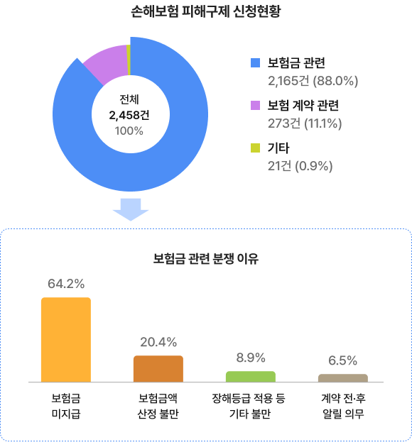 애써 들인 보험이 막상 필요할 때 말짱 도루묵이 된다면 어떤 기분일까요? 한국소비자원이 최근 3년간 손해보험 피해구제 신청현황을 분석한 결과, 전체의 88.0%가 보험금과 관련된 문제로 발생한 분쟁인 것으로 나타났습니다. 구체적인 신청 사유로는 ‘보험금 미지급’이 64.2%(1,579건)로 가장 많았으며, ‘보험금액 산정 불만’도 20.4%(501건)으로 높은 비중을 보였는데요.