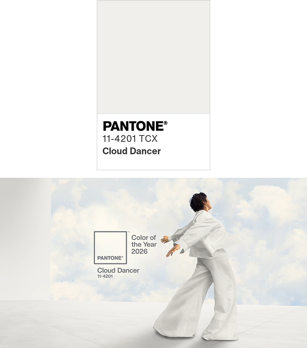 컬러 트렌드하면 가장 먼저 떠오르는 글로벌 색채 연구소 팬톤(PANTONE). 매년 연말이면 다음 해의 트렌드 컬러를 선정해 발표하는 곳으로 잘 알려져 있습니다. 이들은 사회·정치·문화 등 거시적인 메가트렌드를 분석해 컬러를 고르는데요. 빠르게 변화하는 기술 중심의 사회 속에서 오는 과한 자극으로부터 피로를 느끼는 현대인을 위해 2026년에는 차분한 ‘클라우드 댄서(Cloud Dancer)’를 올해의 컬러로 선정했다고 합니다. 클라우드 댄서(Cloud Dancer)는 부드러운 화이트 계열 컬러로, 보는 이로 하여금 차분함과 평온함, 균형감을 선사합니다.