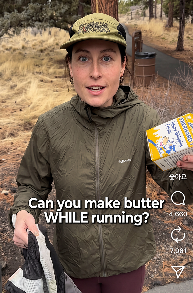 시작은 러닝 인플루언서 리비 클레어(Libby Claire)가 생크림과 소금을 넣은 지퍼백을 가방에 넣고 달리면서 출발했는데요. 러닝 후 지퍼백 속에서 완성된 버터를 빵에 발라 먹는 모습이 영상으로 공개되면서 화제가 되었습니다.